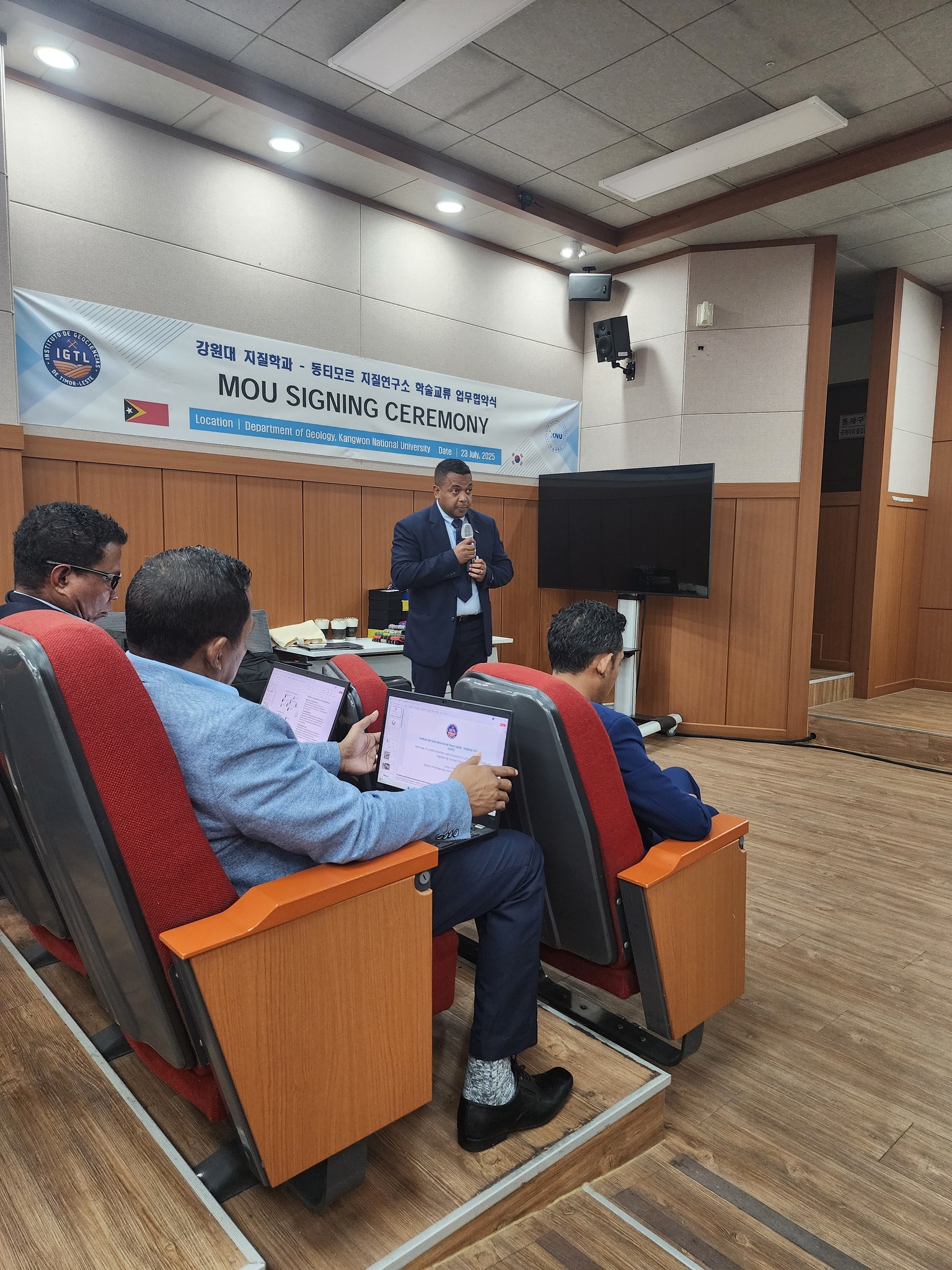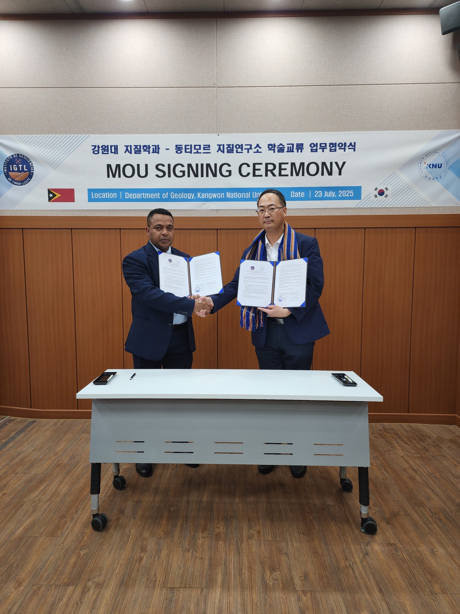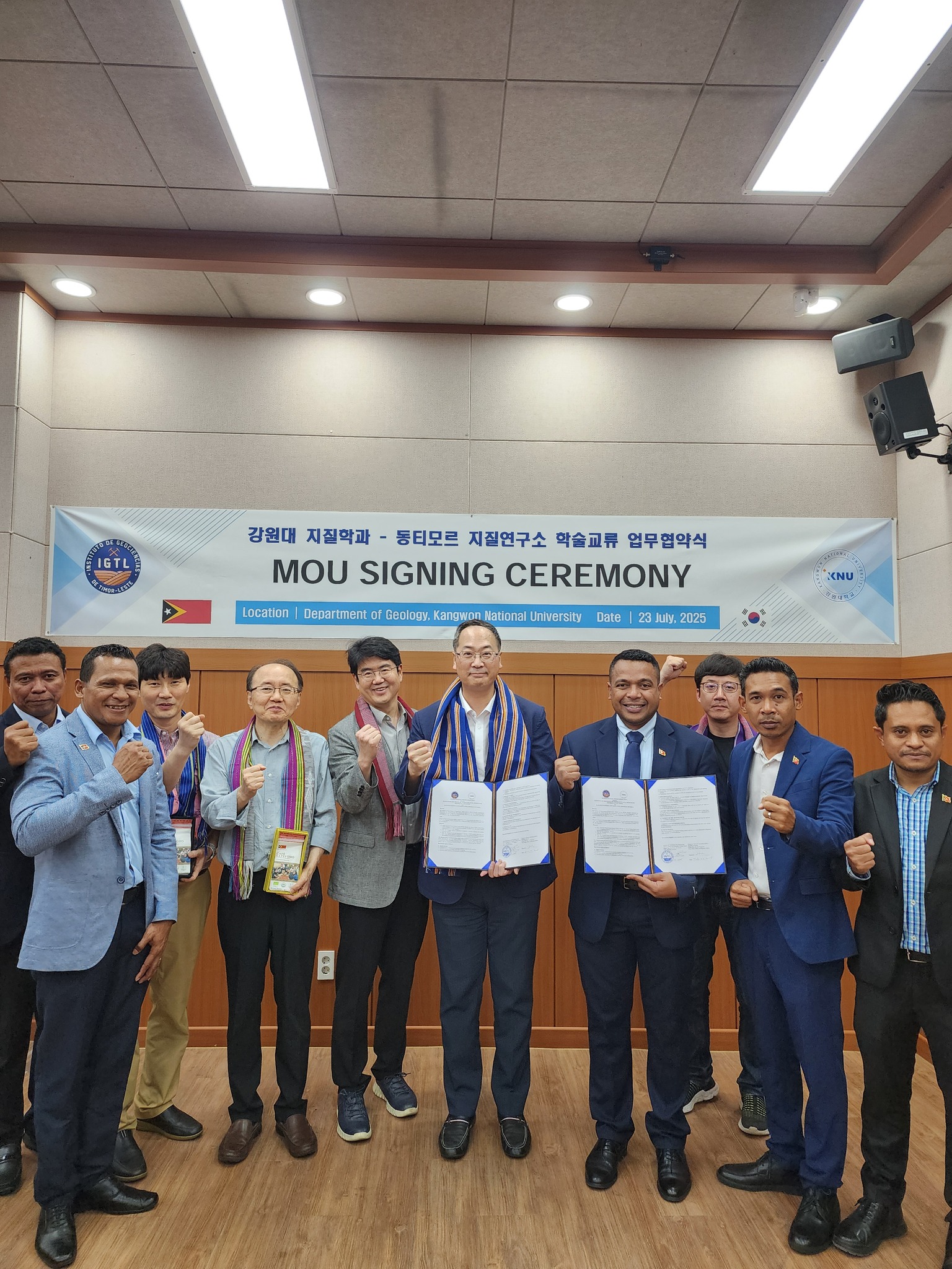 Iha dia 23 de Julho, 𝐈𝐆𝐓𝐋 asina MOU segundu ho 𝐊𝐚𝐧𝐠𝐰𝐨𝐧 𝐍𝐚𝐭𝐢𝐨𝐧𝐚𝐥 𝐔𝐧𝐢𝐯𝐞𝐫𝐬𝐢𝐭𝐲 (𝐊𝐍𝐔) iha Chuncheon ho objetivo atu promove troka ezpertu akademika no peskiza hamutuk iha área geológia. Akordu ida ne’e sei fasilita servisu kampu hamutuk, troka estudante no profesór, no fó oportunidade atu halo estudu pós-graduadu ba funsionáriu IGTL. Inisiativa ida ne’e hetan asesoria teknika husi Korea International Cooperation Agency (KOICA) no KIGAM, no espera atu aumenta imajen KNU iha komunidade sientifika geológika iha rejiaun Ázia-Pasífiku.